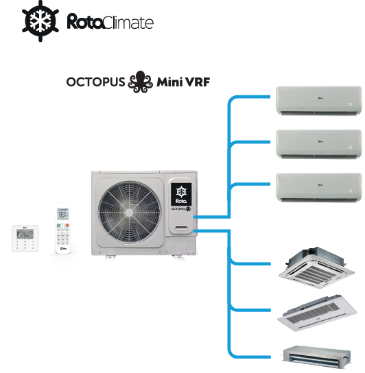 Rota Octopus mini VRF, çoklu havşalı bağlantı seti ile kurulumu çok basit hale getirir ve önemli yer tasarrufu sağlar. Toplam 130 metre boru uzunluğuna imkan verir. İç üniteler arası yükseklik farkı max. 10 metredir. 28.000 BTU dan 60.000 BTU’ya kadar farklı 6 model ile her ihtiyaca cevap verir. Akıllı tek bir otomatik kontrol cihazı ile sistemi kontrol imkanı sağlar. Kaset ve Kanallı tip iç ünitelerin tamamı drenaj pompalıdır.
